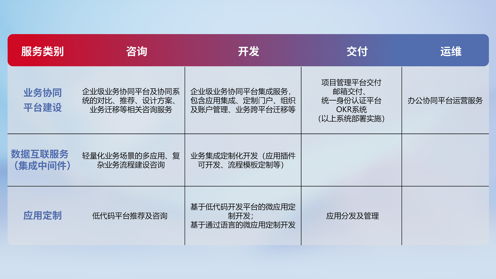 针对钉钉、、、、企微、、、、IDaas等平台级产品提供产品的规划、、方案、、、交付、、、定制化开发等服务,,,实现如统一协同办公、、、智能客户服务、、、混合会议管理、、、、智能数据查询、、、等业务场景,,,,实现数字化转型。。